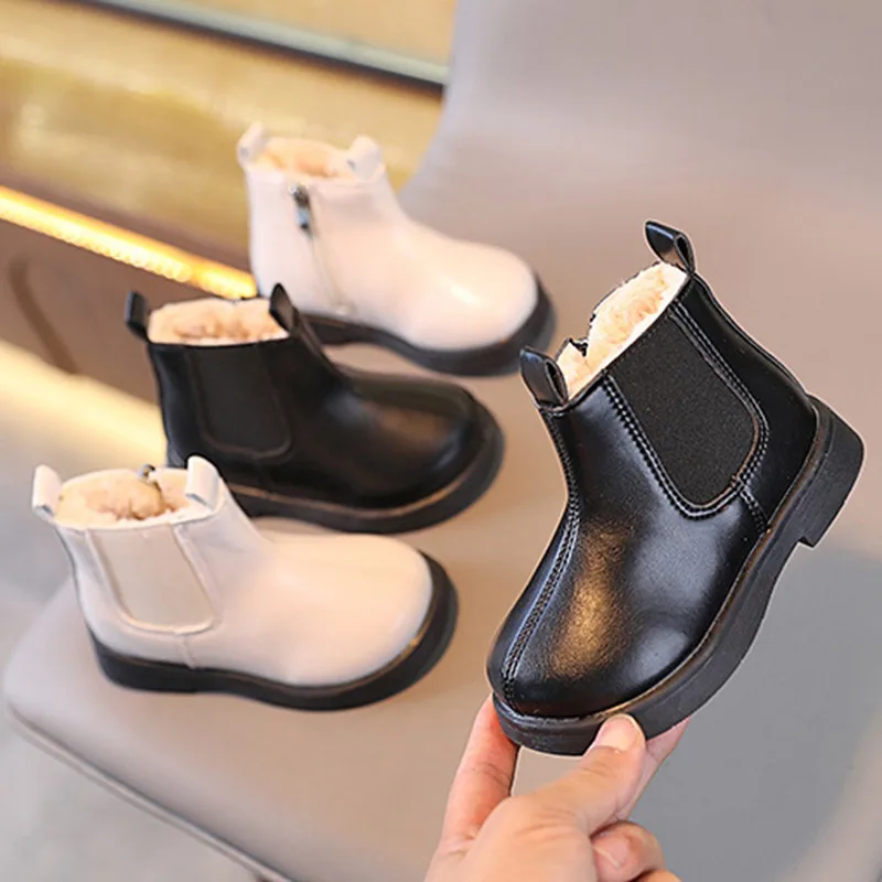 Baywell Autumn Winter Boys Girls British Leather Fashion Shoes Casual Comfortable Short Boots Kids Zipper Anti-slip Martin Boots