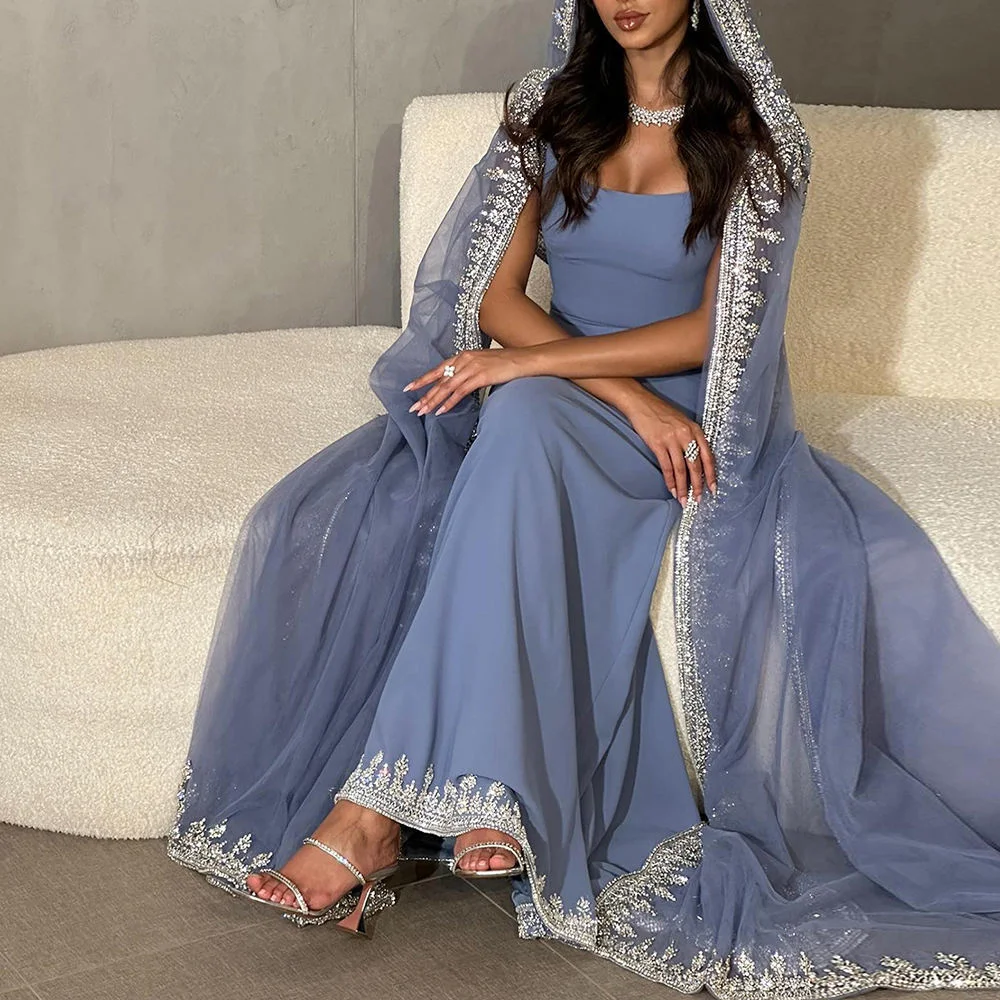 Bella Mist Blue Beaded Edge Prom Dresses Long Shawl Wedding Dress Customized Sleeveless Floor-Length Satin Vestidos De Fiesta
