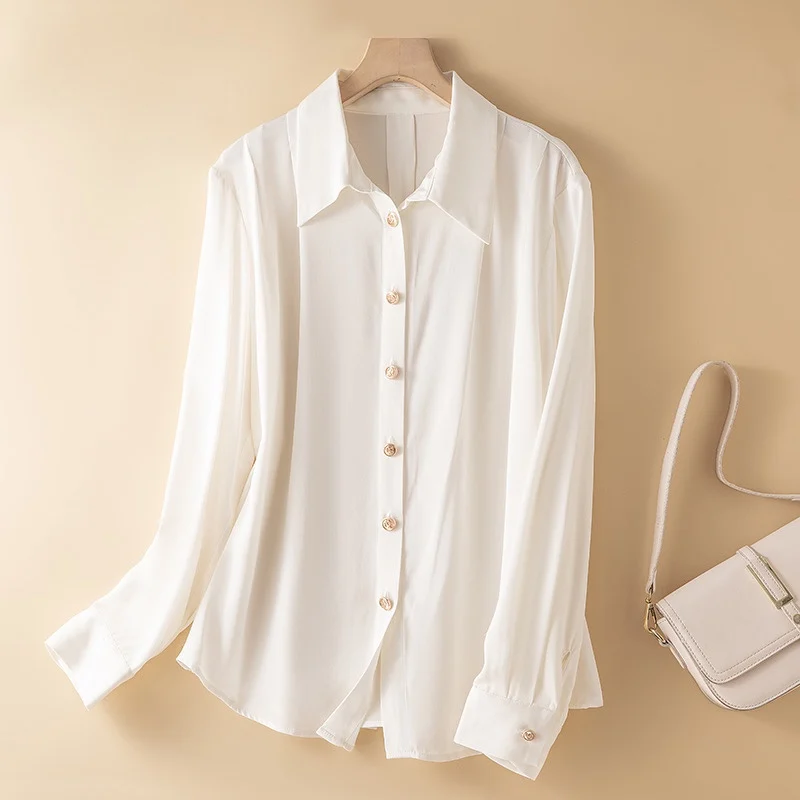 2024 Spring/Autumn New 93%Natural Silk Elastic Double Qiao Satin White Solid Color Versatile Fashion Women's Long Sleeved Shirt