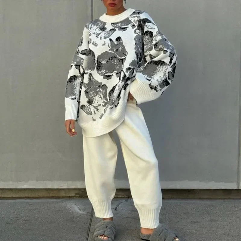 Women Knitted Two-Pieces Sets O-neck Sweater+Pants 2024 Spring Autumn Casual Tracksuit Cute Cartoon Female Fashion Warm Outfits