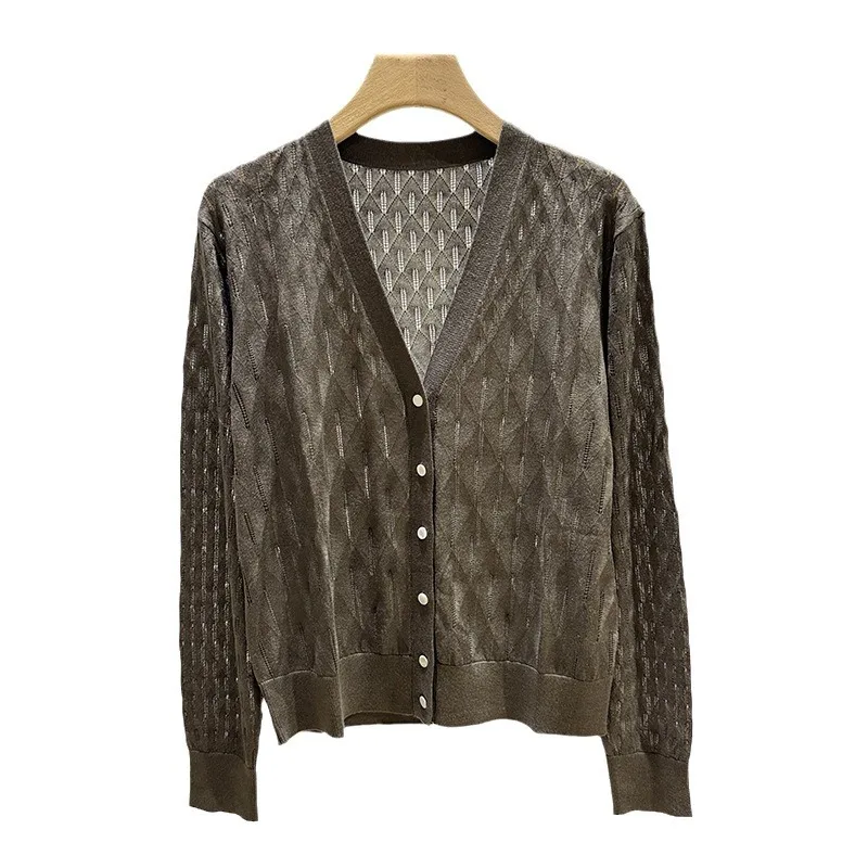 Women's Cardigan 2024 New Spring Autumn Silk Hollow Out V-neck Single Breasted Loose Casual Long Sleeve Sweater