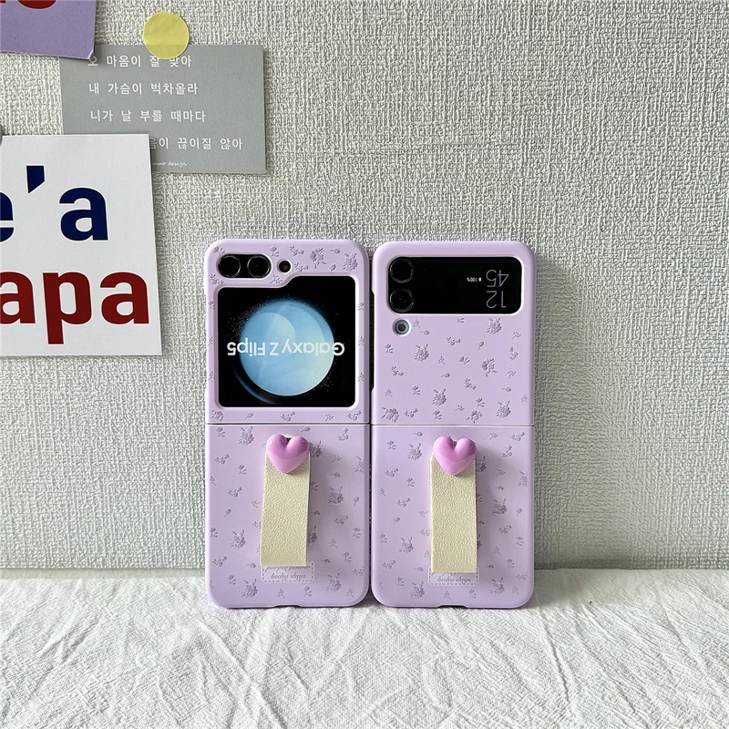 Etui na telefon Samsung Galaxy Z Flip 6 5 4 3 Z Flip5 ZFlip5 Ins White Purple Flower Love Heart Ring Shockproof Back Cover