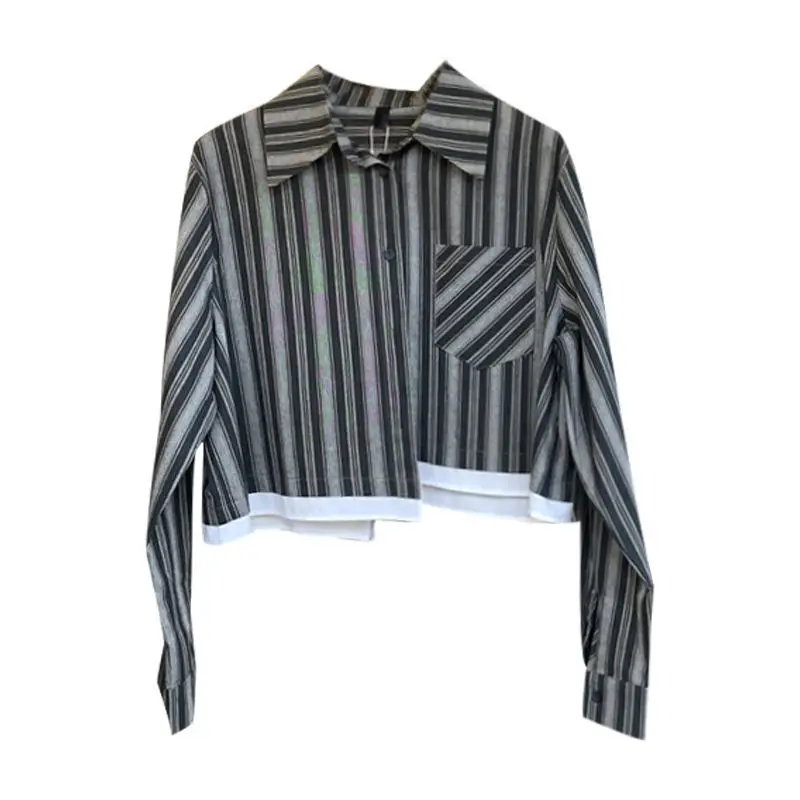 QWEEK Korean Style Striped Short Shirt Irregular Elegant and Youthful Woman Blouses Office Long Sleeve Autumn Women's Clothes