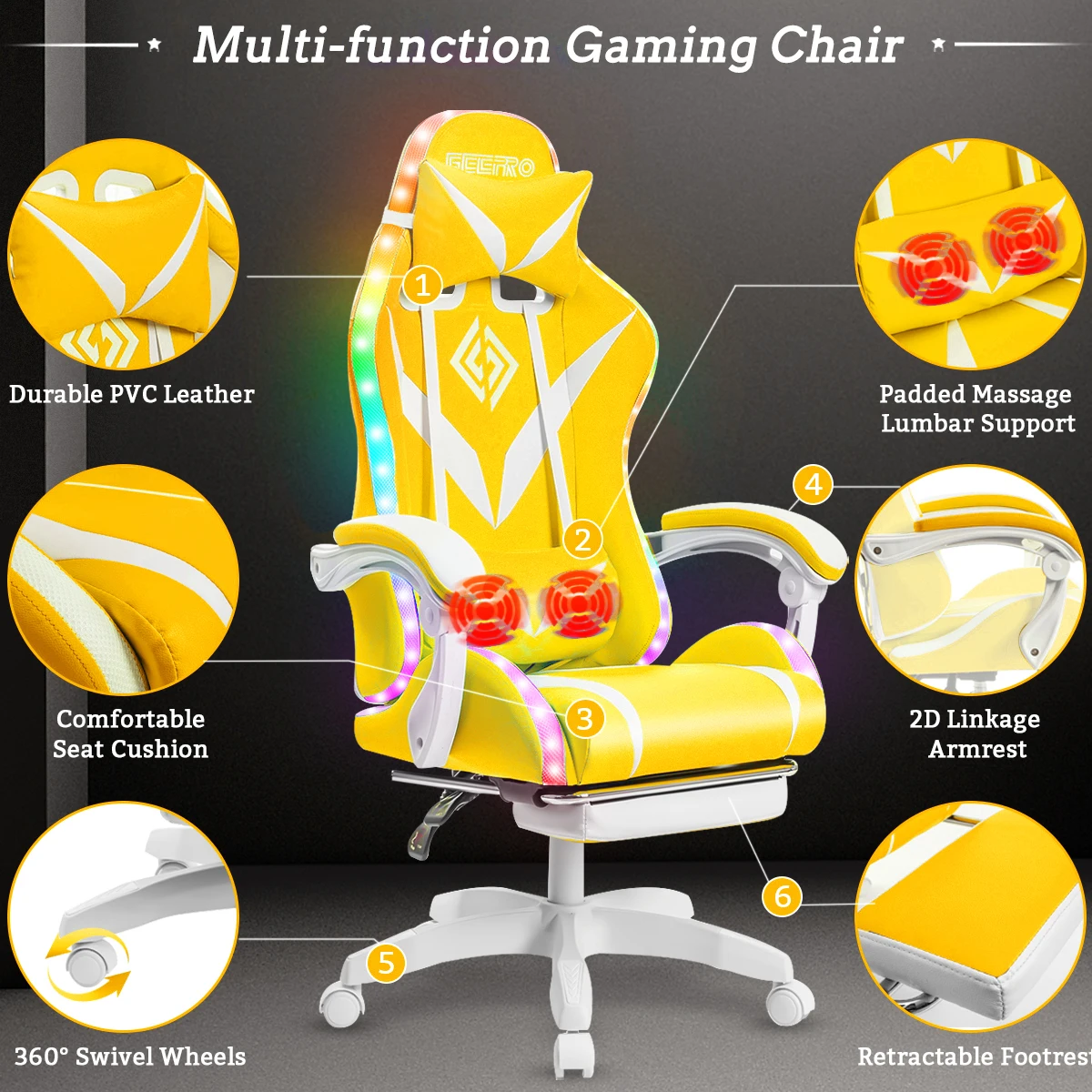 Hoffree Krzesło do masażu do gier Podnóżek Obrotowe ergonomiczne krzesło biurowe do komputera wyścigowego z głośnikiem Bluetooth LED