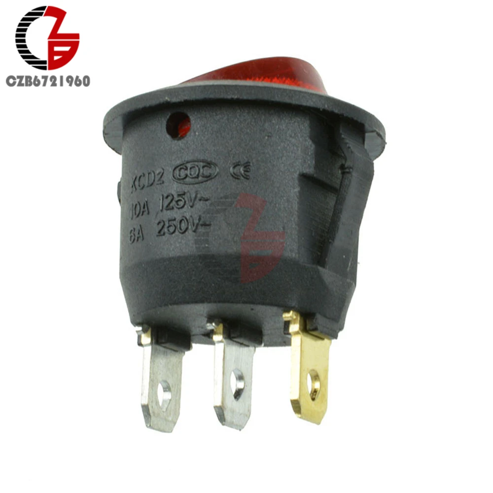 Mini 3Pin Round Push Button Switch On-Off SPDT Toggle Rocker Switch Red LED Light Indicator Embedded 6A 250V 10A 125V AC